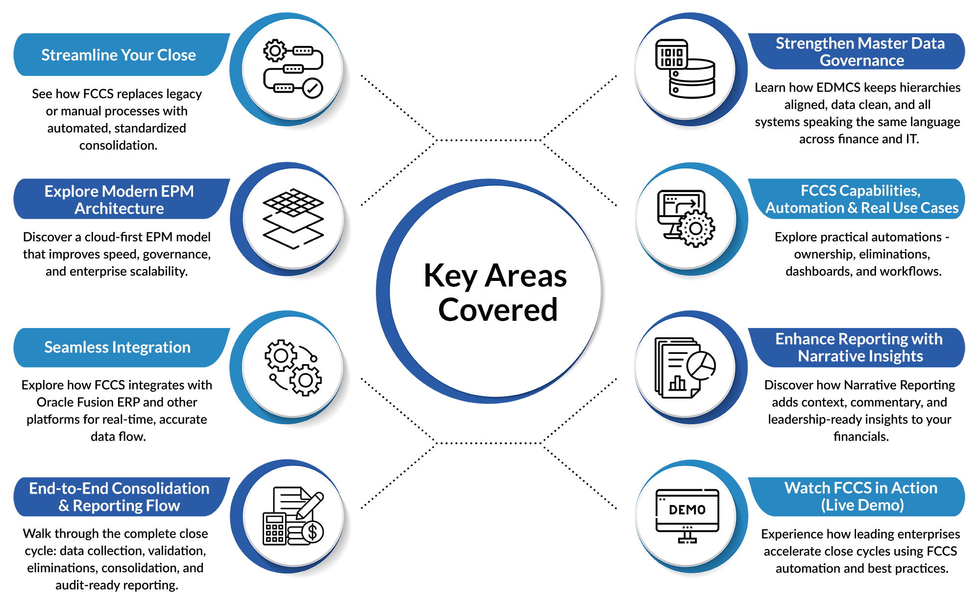 In this on-demand webinar, our experts will demonstrate how Oracle FCCS brings automation, accuracy, and control to everystage of the close – from data consolidation and validation to reporting and team collaboration.